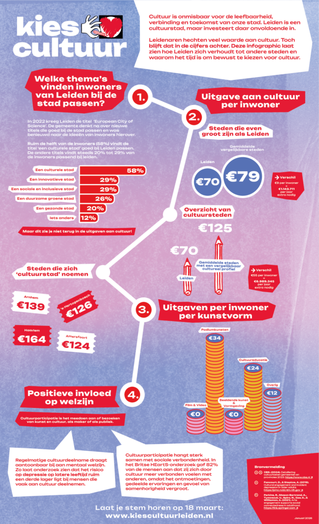 Maar de rijkdom van de Leidse cultuur staat onder druk. Leidse instellingen, makers en initiatieven die onze stad kleur geven, worstelen met te weinig middelen om hun waardevolle werk voort te zetten. Terwijl investeren in cultuur investeren is in de toekomst van Leiden: het versterkt het welzijn van inwoners, trekt bezoekers aan, ondersteunt ondernemers en geeft Leiden de unieke uitstraling die ons zo trots maakt.